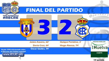 El equipo cadete B del Real Club Recreativo de Huelva perdió por 3 goles a 2 ante el 1889 en el Delegado Francisco González.