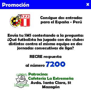 La Recre.org acabó la temporada para el Recreativo regalando entradas para el último encuentro de la campaña, por cortesía de Cafetería La Extremeña de Mazagón, que ha tenido a bien prorrogar la iniciativa para el encuentro del próximo sábado que disputará la selección española ante la de Perú.