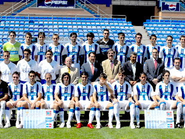 MAURISOFT. Por segunda temporada consecutiva, la primera foto oficial de la plantilla tiene lugar con motivo de la visita de Antonio Pulido como presidente de Cajasol, principal patrocinador del Recreativo de Huelva