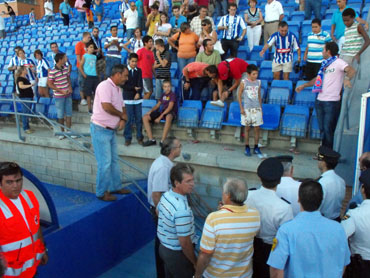 El encuentro del pasado domingo en el Nuevo Colombino dejó a su finalización una imagen en forma de accidente. La valla de tribuna situada justo a la izquierda del túnel de vestuarios cedió cuando el interior del Recreativo Kanga Akalé se disponía a regalar la camiseta de su debut con el Decano a los aficionados. Afortunadamente, todo quedó en un susto y no hubo ningún herido de gravedad. Autor: MauriSoftOpina sobre esta noticiaLee las opiniones de los visitantes sobre esta noticia