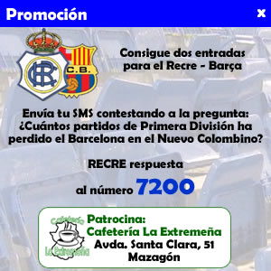 Todos los aficionados interesados en participar deben enviar un SMS con la respuesta a la pregunta que os planteamos al número de teléfono 7200, precedida por la palabra clave RECRE, antes del mediodía de hoy sábado, momento en el que se realizará el sorteo. Entre todos los acertantes sortearemos dos localidades para el encuentro del domingo, por cortesía de Cafetería La Extremeña de Mazagón, lugar donde por la tarde entregaremos esas dos localidades.