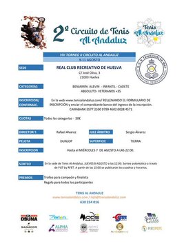 El Real Club Recreativo de Tenis de Huelva organiza la octava edición del torneo del 2º circuito de tenis Al Ándalus. Tendrá lugar del 9 al 11 de agosto en las instalaciones del Real Club Recreativo de Tenis de Huelva en la calle José Oliva.