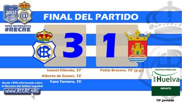 El equipo infantil B del Real Club Recreativo de Huelva venció por 3 goles a 1 al S.M.D. Cartaya el pasado domingo. Se adelantó por mediación Ismael Olmedo en el minuto 37.